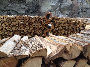 Winter lingers on a little. Mountains to the north are dusted with fresh snow. Magnolias, forsythia and daffodil blooms shiver in the breeze, and curl up against the sudden chill. Inside at the Brattleboro Museum and Art Center, a new spring exhibit, Bridging Earth and Sky. Outside, eye-catching stacks of wood, shaped into sculptural forms. Artistry in utility and function. Back home, the wood-burning stove takes the chill out of a cloudy spring day.